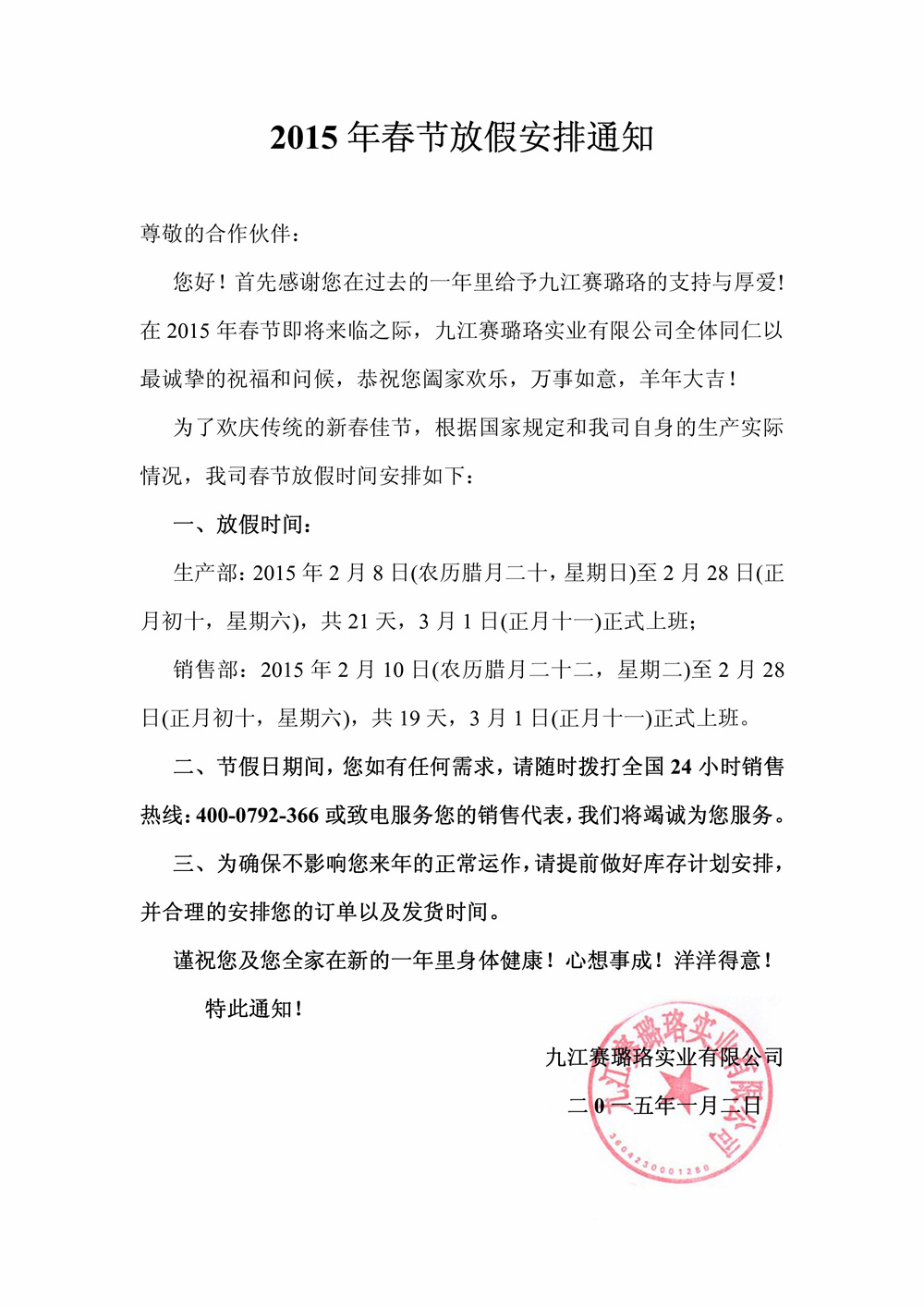 您好!首先感謝您在過(guò)去的一年里給予九江賽璐珞的支持與厚愛(ài)! 在2015年春節(jié)即將來(lái)臨之際,九江賽璐珞實(shí)業(yè)有限公司全體同仁以最誠(chéng)摯的祝福和問(wèn)候,恭祝您闔家歡樂(lè),萬(wàn)事如意,羊年大吉!