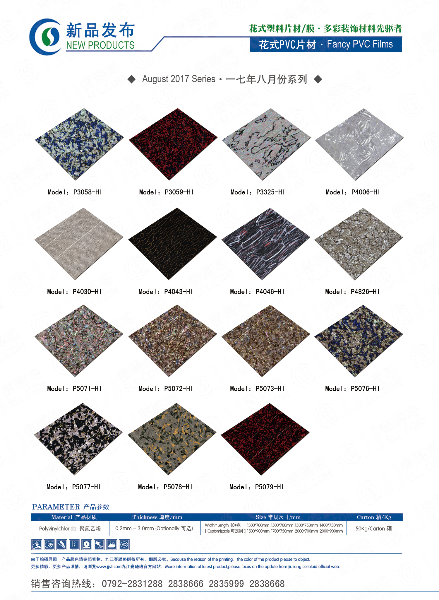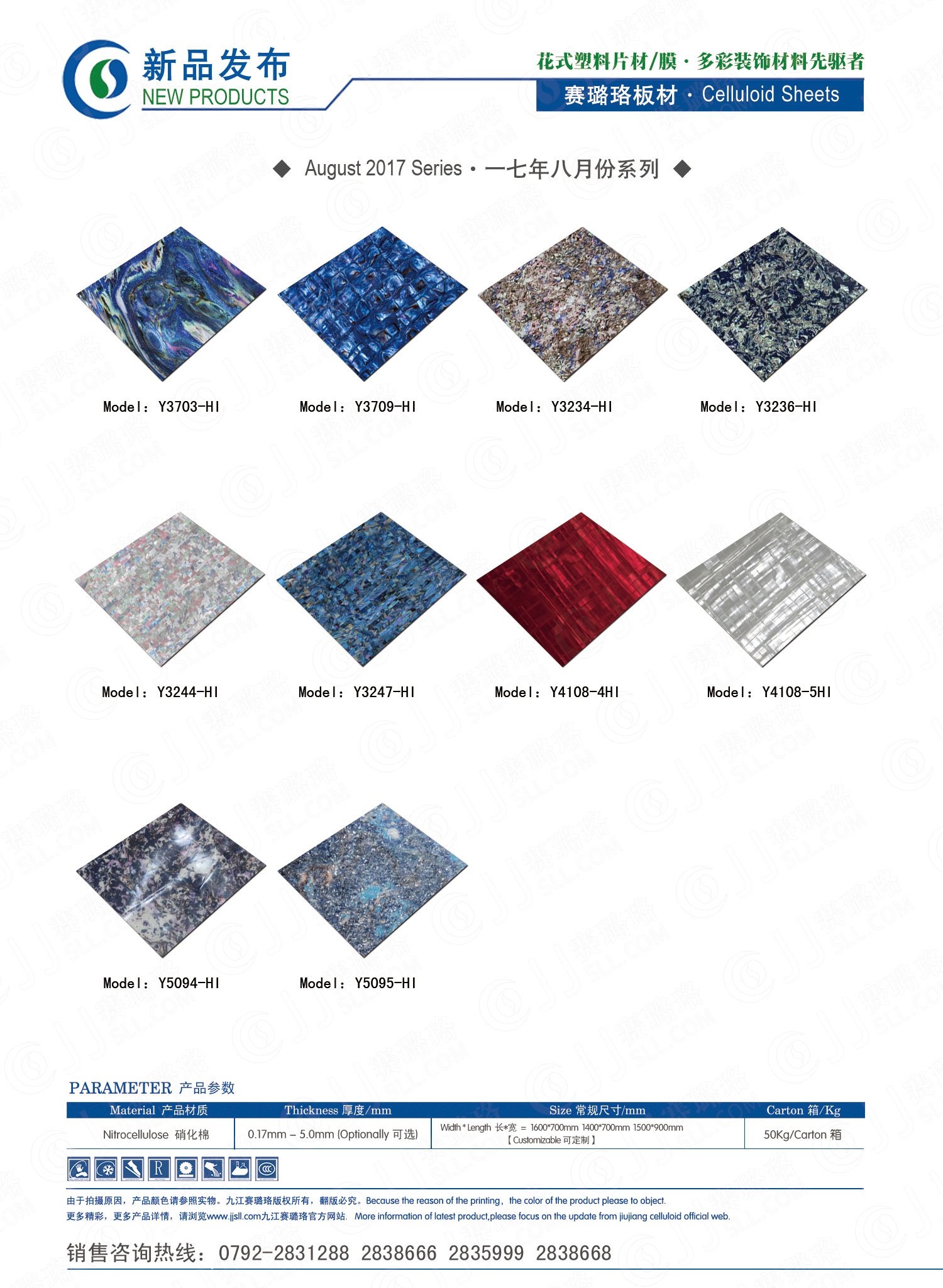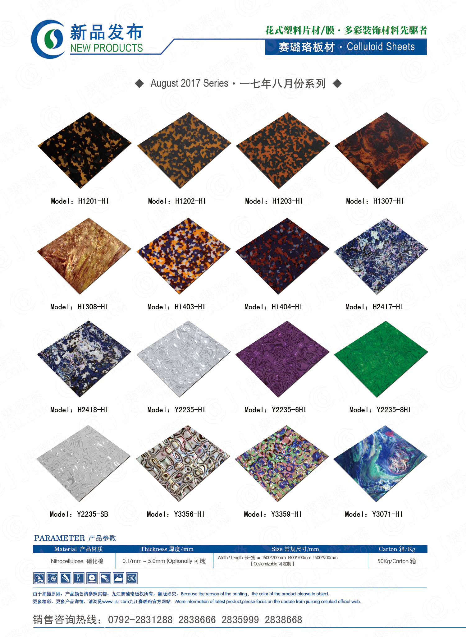 九江賽璐珞實業(yè)有限公司2017年八月份賽璐珞板材、瑪瑙膜、理石膜、樂器裝飾材料、花式PVC片材新品發(fā)布,花式塑料片材/膜·多彩裝飾材料先驅(qū)者。咨詢熱線:0792-2838668 / 2831288 / 2838666 / 2835999。點擊圖片查看詳細產(chǎn)品